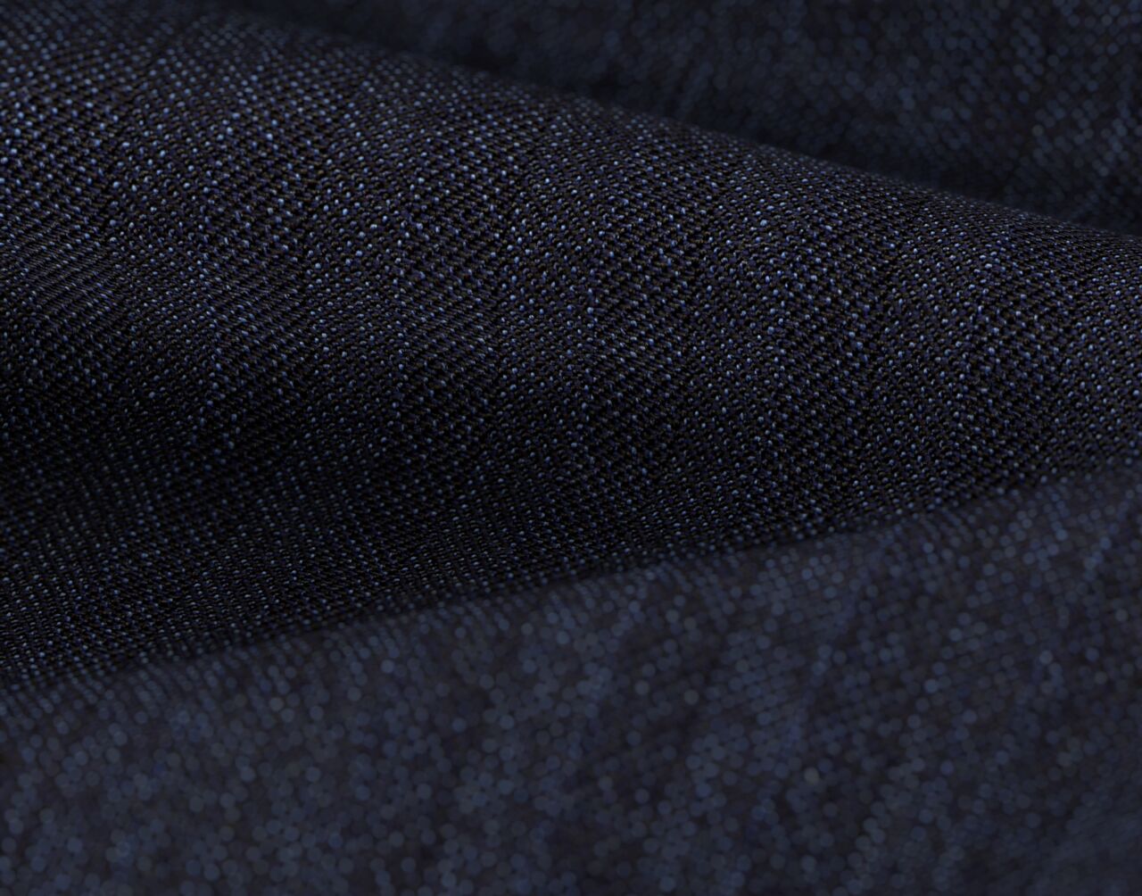 【秋冬生地】2/2綾組織のヘリンボン柄です。黒色のベースにブルーと黒の杢糸を入れることで色合いを出しています。