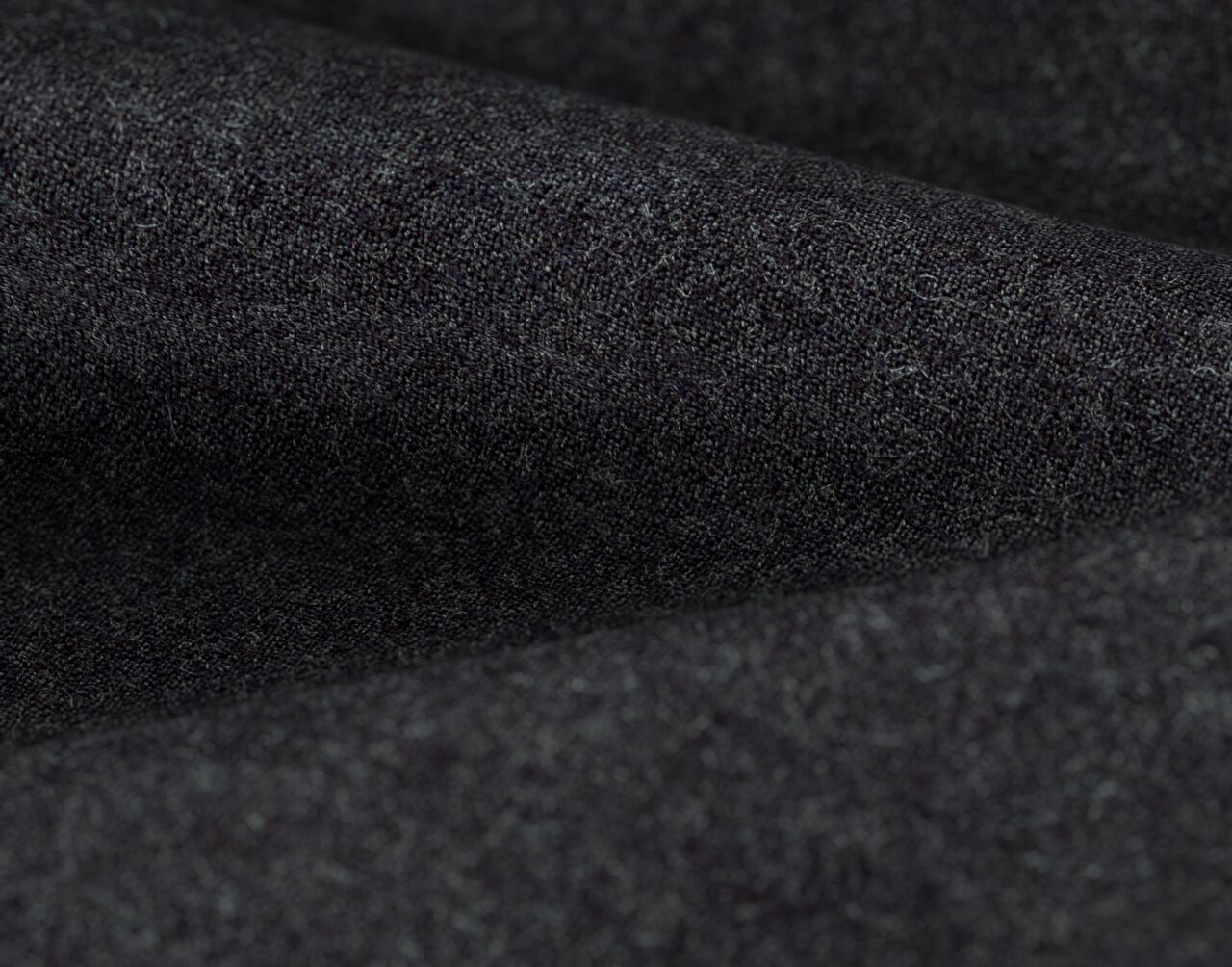 【秋冬生地】中番手の糸を使い、縮絨によって密でありながら膨らみを持たせてあり、フェルト感のある仕上げが特徴の素材です。タテ糸ヨコ糸とも同色の色で織られており、深い色合いを表現しています。
