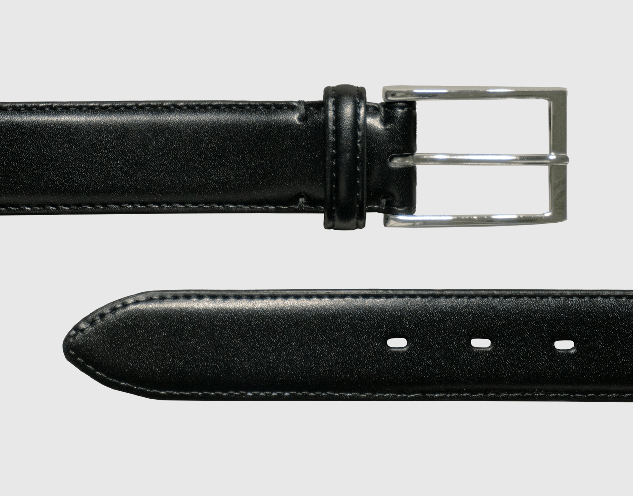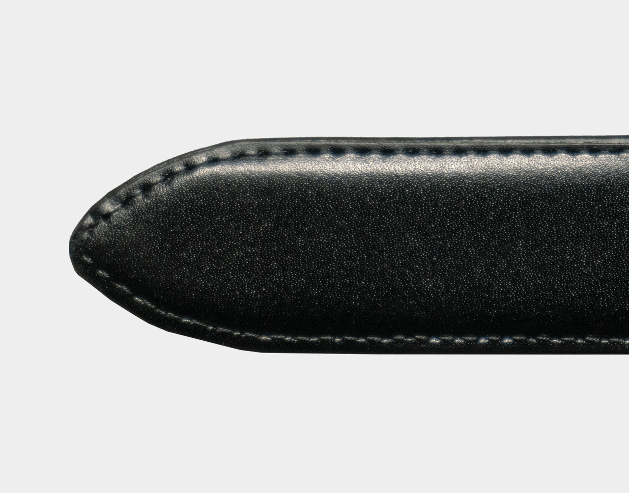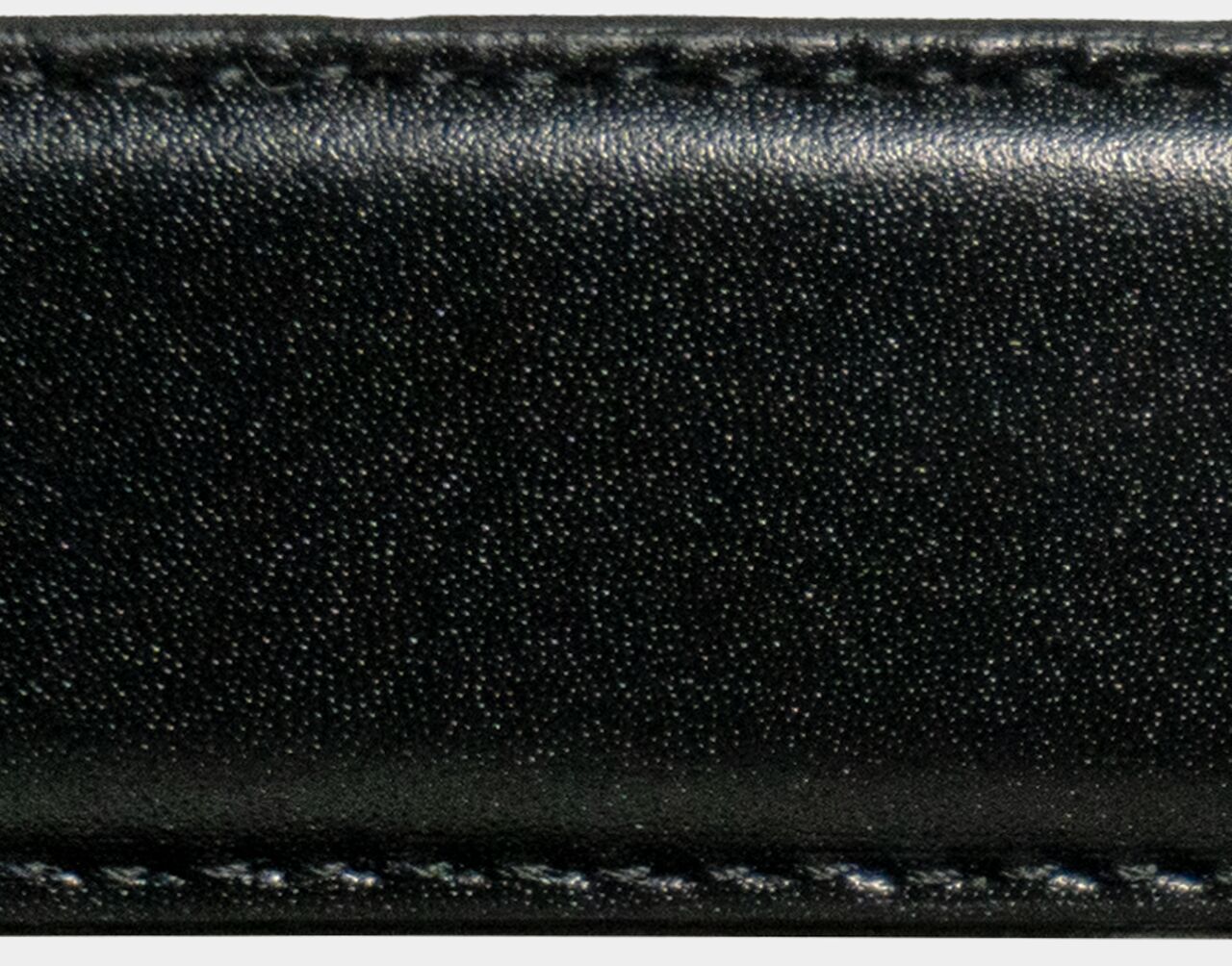 このツヤ感はクロム鞣しの特徴。クロム鞣しとは、塩素性硫酸クロム鞣剤で鞣す事をいい、経年劣化が少なく、柔らかく柔軟性があり、耐久性にも優れた素材。透明感のある仕上がりがベルトを演出。