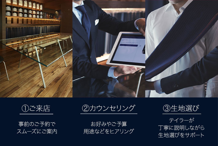 お客様にゆったりと生地をお選びいただき、テイラーがじっくりとご相談を承れるよう、ご来店予約を推奨しております。