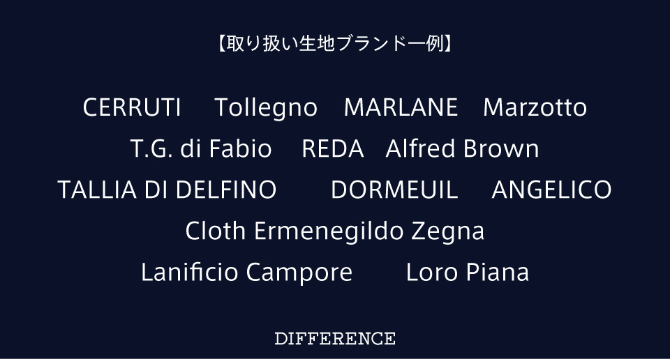 DIFFERENCEが厳選したインポート生地を、1着あたり¥49,000〜(¥53,900 tax in〜)という特別な価格でお求めいただけます。