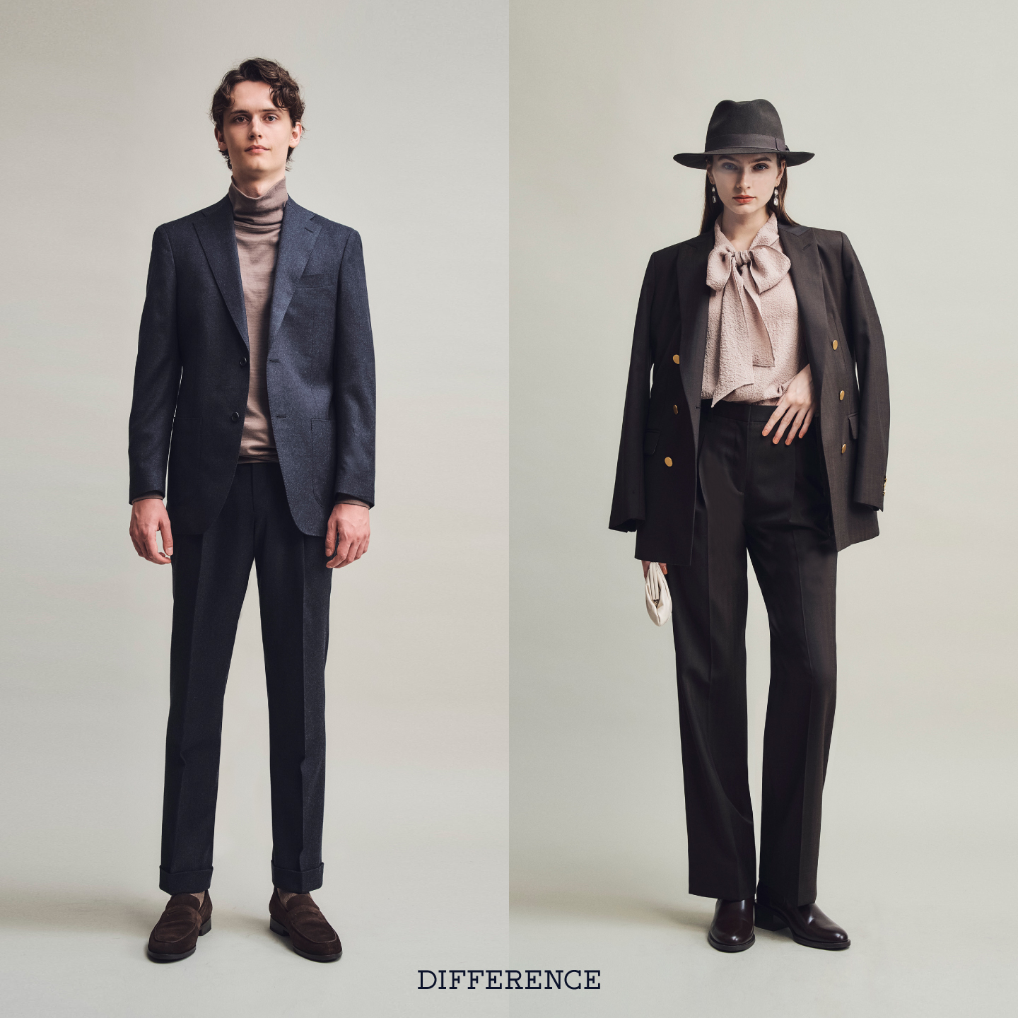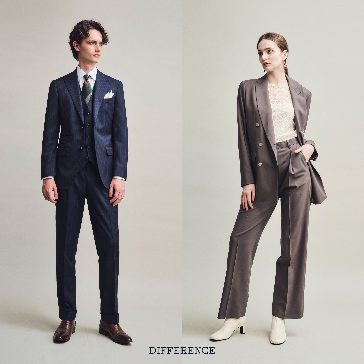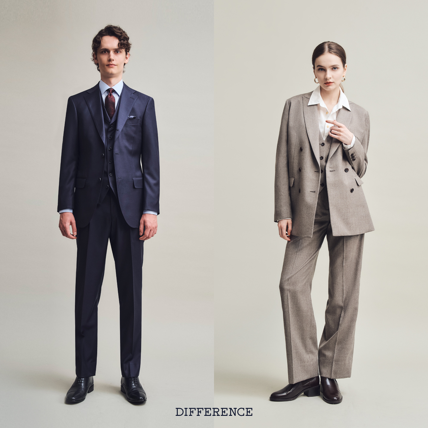 プロのテイラーが細部まで詳細に調整し、あなたの体型を最も美しく見せるシルエットを構築。 最高級の素材による「自分だけの一着」として纏う贅沢を、DIFFERENCEでご体験ください。