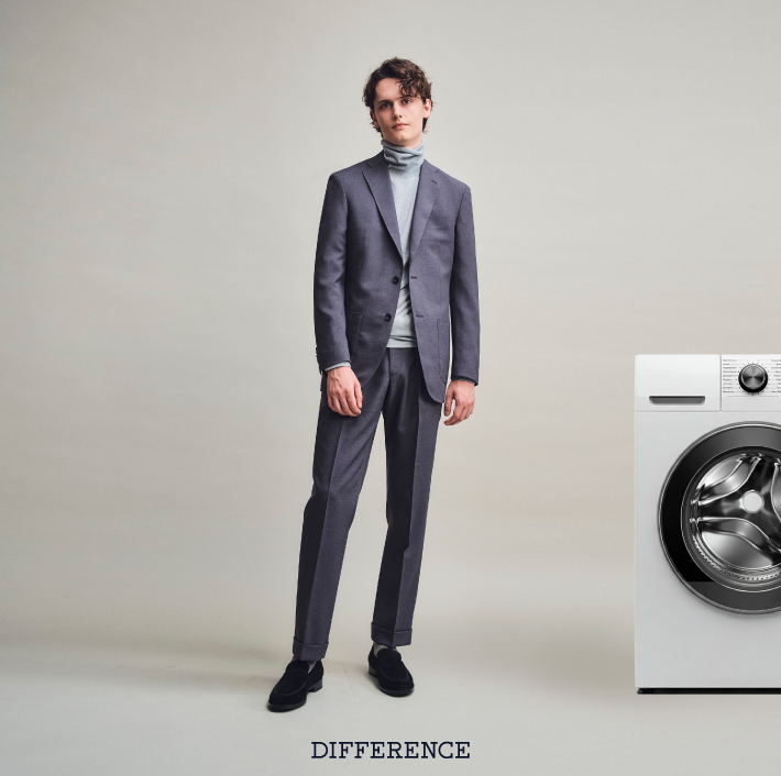 DIFFERENCEのウォッシャブルスーツはご自宅で手軽に洗えるから、いつも気持ち良く、清潔な状態で袖を通せます。あなたのビジネスシーンを、より快適で、よりアクティブなものへと変える、スマートな選択です。