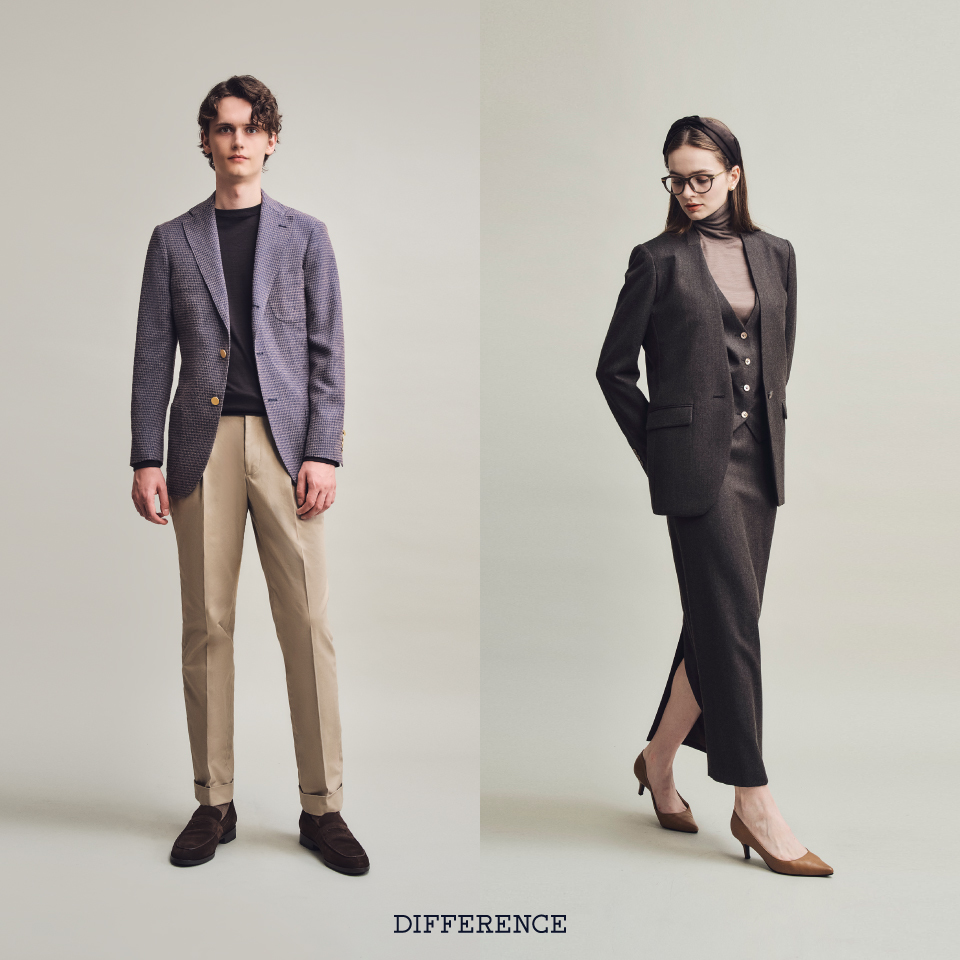 クラシックなテーラードファッションを大切にしながらも、生地感や色柄・着こなしなどでさりげなくスポーティーな雰囲気を取り入れた、DIFFERENCEの掲げるビジネスカジュアルスタイル、それが“DIFFERENCE Business Casual=DBC”です。