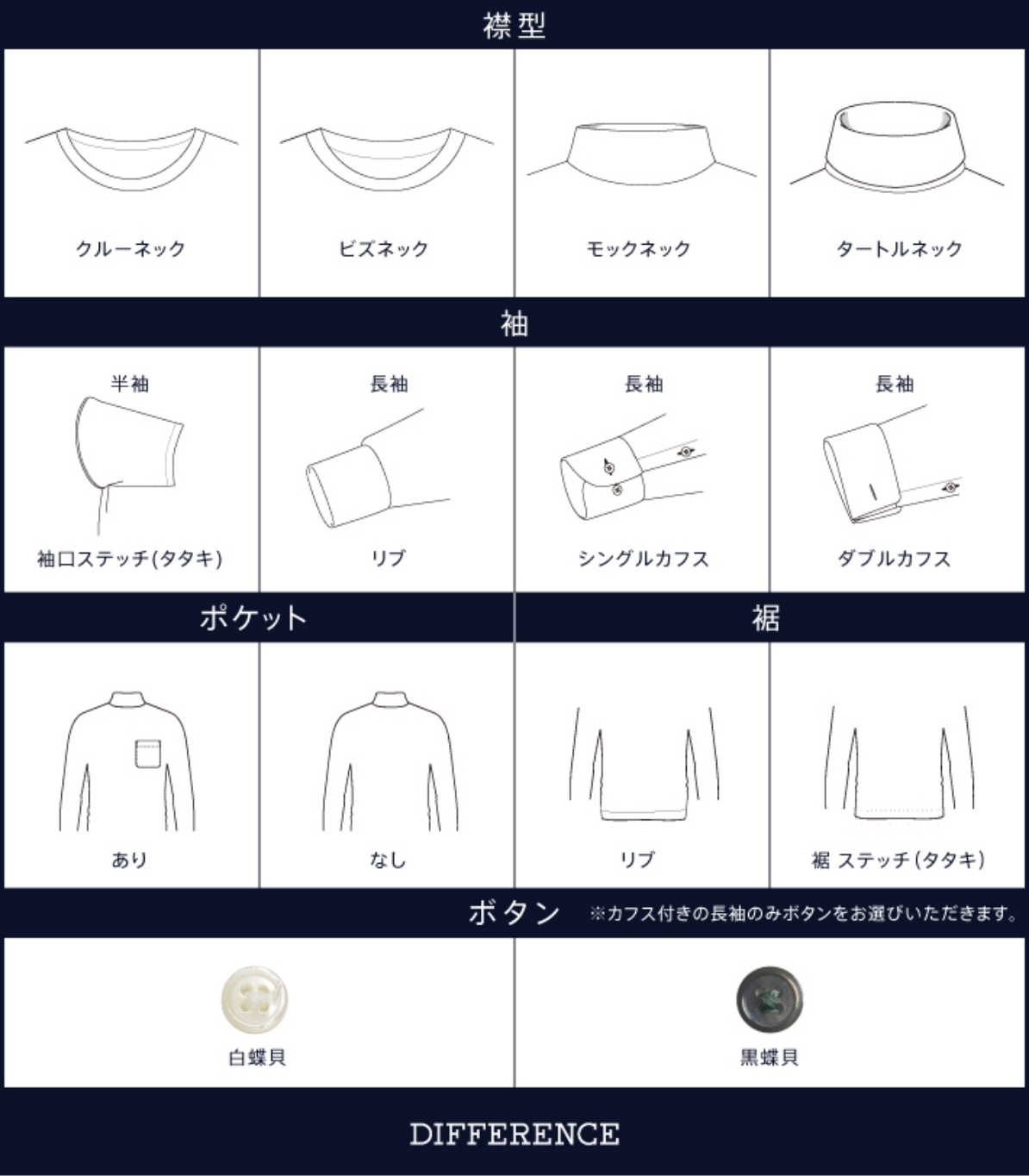クルーネック、ビズネック、モックネック、タートルネックと、既製服では難しい豊富なデザインをご用意しました。あなたの理想のスタイルを自由に表現いただけます。