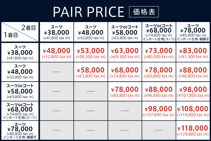 ※PAIR PRICEは、スーツ+スーツ/スーツ+コート/コート+コートで2着を自由に組み合わせ可能です。