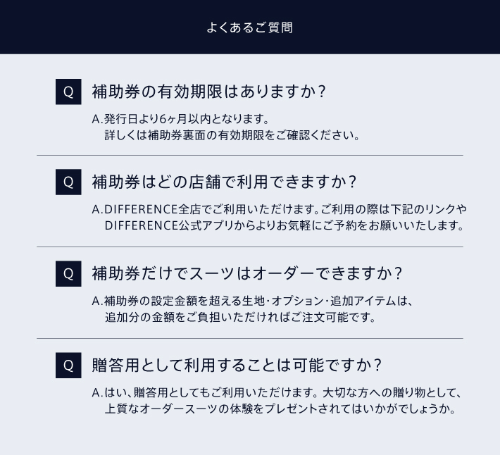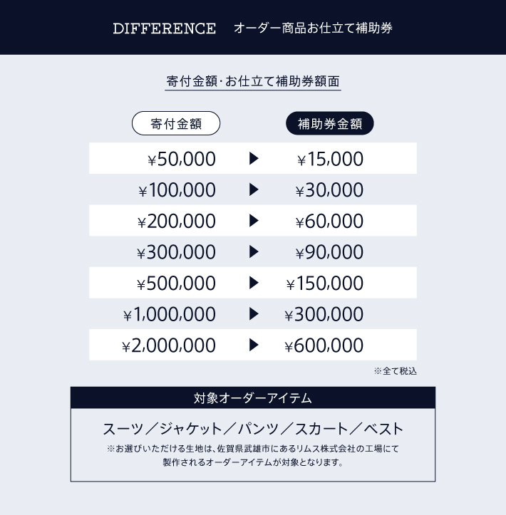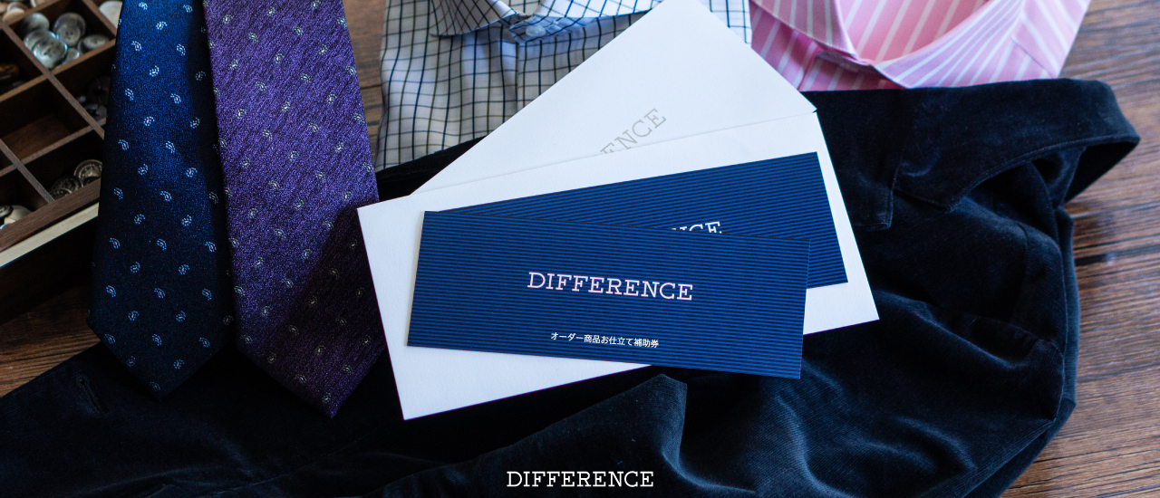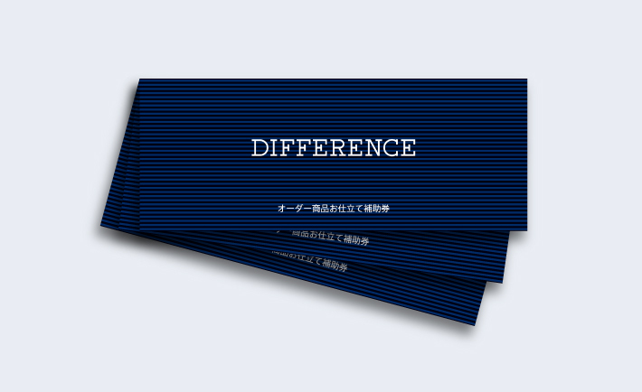 DIFFERENCEのオーダー商品お仕立て補助券は、ふるさと納税の寄付を通じて、上質な装いを手に入れられる新しい選択肢ですあなたのライフスタイルを豊かにして、品格を一層高める一着との出合いを心ゆくまでお楽しみいただけます。