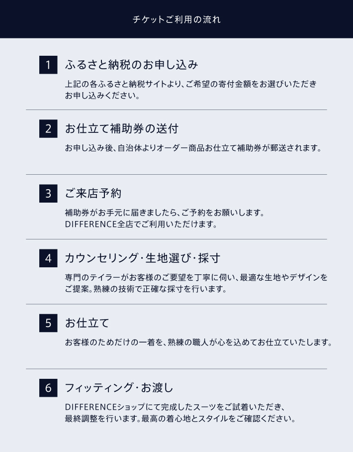 ふるさと納税を通じて、DIFFERENCEが贈る上質なオーダースーツを、ぜひこの機会にご体験ください。