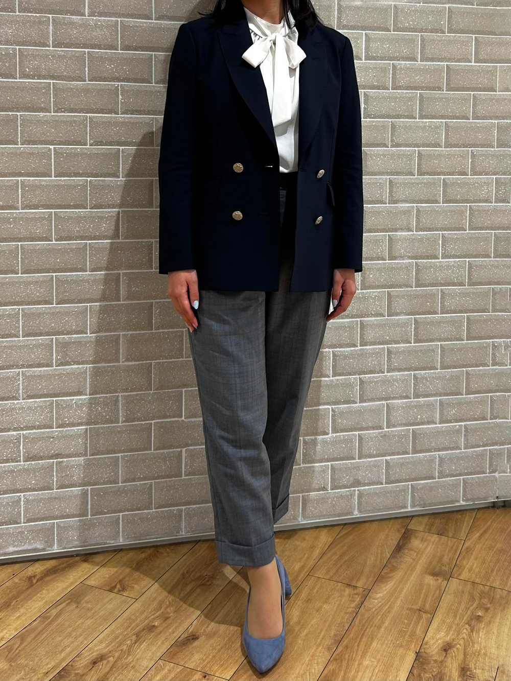 定番の合わせ方の紺ブレと、グレーのパンツで、春夏らしい明るい印象でまとめました。