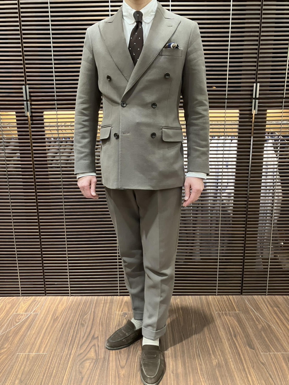 とろみ感のある生地を6つボタンダブルでクラシックとのミックステイスト。 コーディネートは、ホワイトとブラウンでシンプルに表現。 生地品番:4210022(ウール混ダブルクロス)