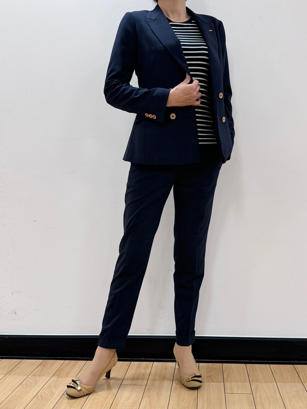 ボタンと襟ボタンホールにパステルカラーを使用し涼しげな印象に。ボーダー柄のインナーでカジュアル感も演出。 生地品番 : 3220015(WOOL AIR)
