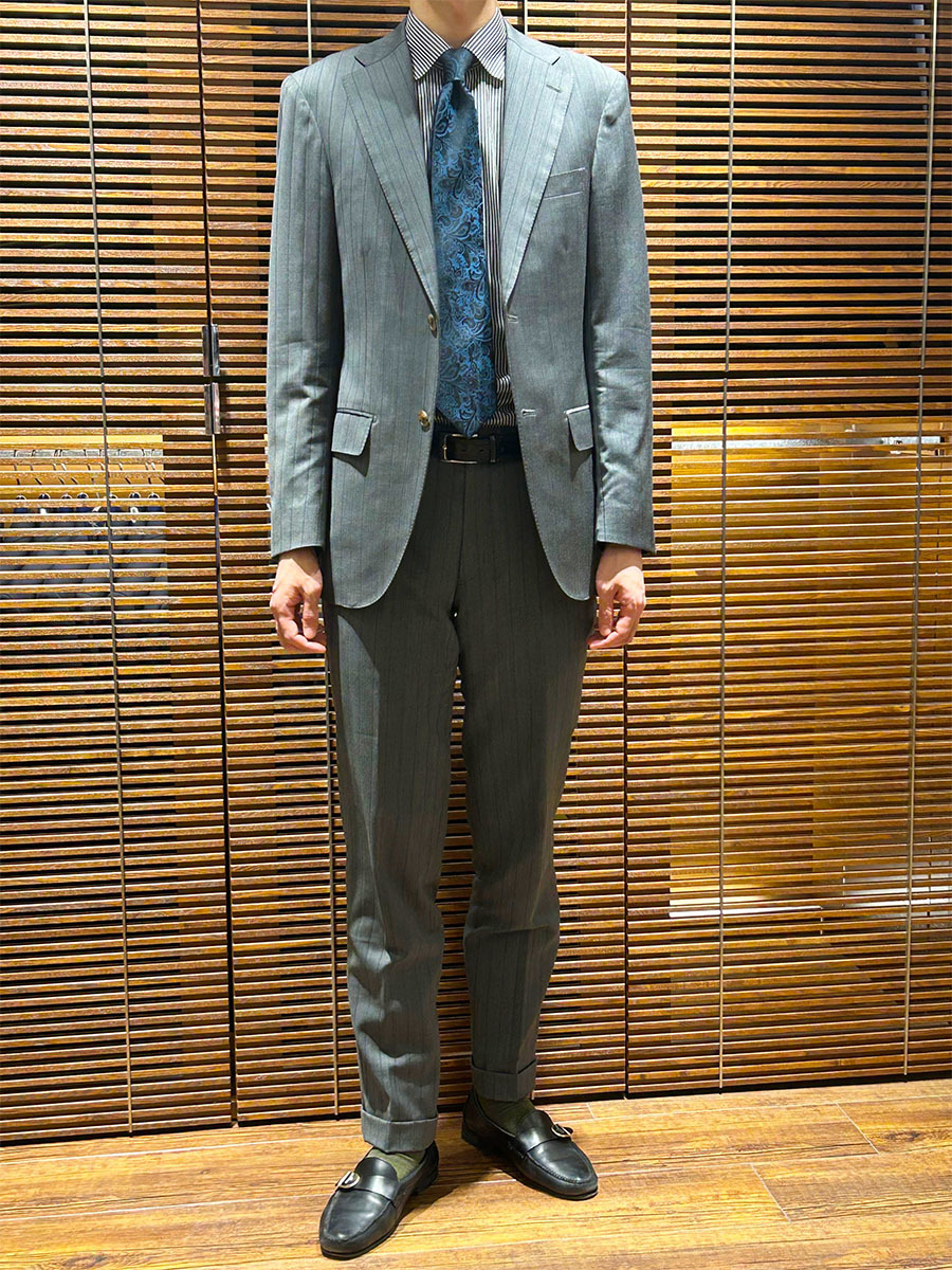 ライトグレーのストライプスーツに、Vゾーンはダーク系の色味でまとめた、シンプルなコーディネート