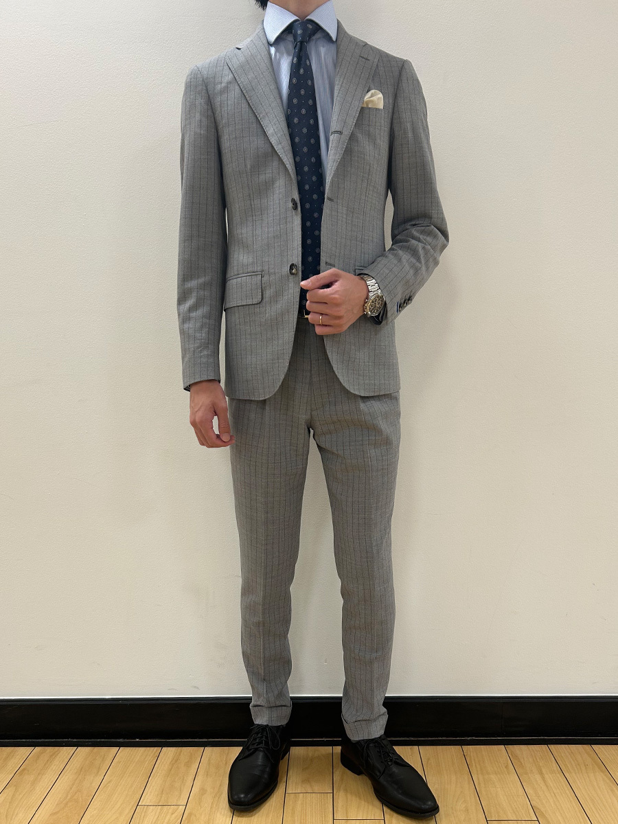 ライトグレーのスーツにブルー系のシャツタイで春らしさを演出。