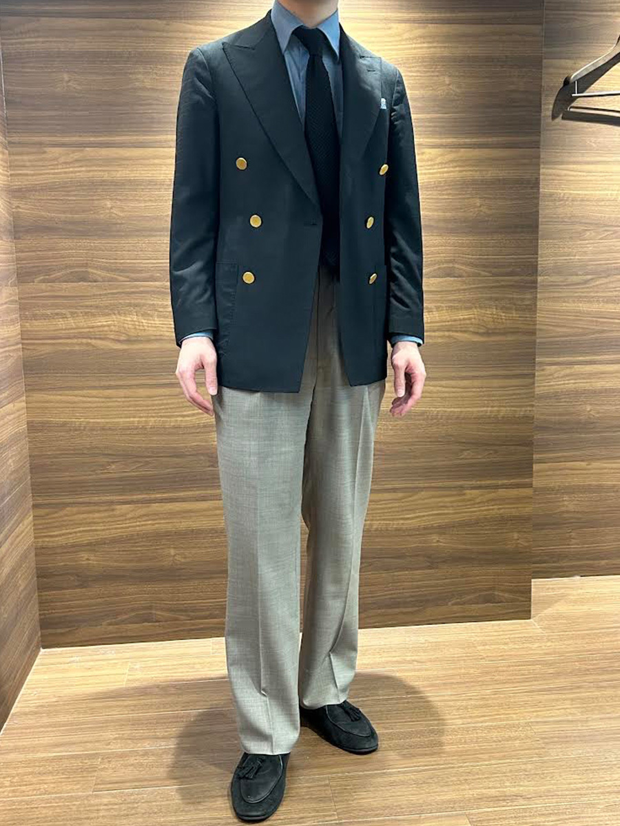 ベージュのフレアパンツを軸に、ブラックのブレザーを合わせ、クラシックなコーディネート。