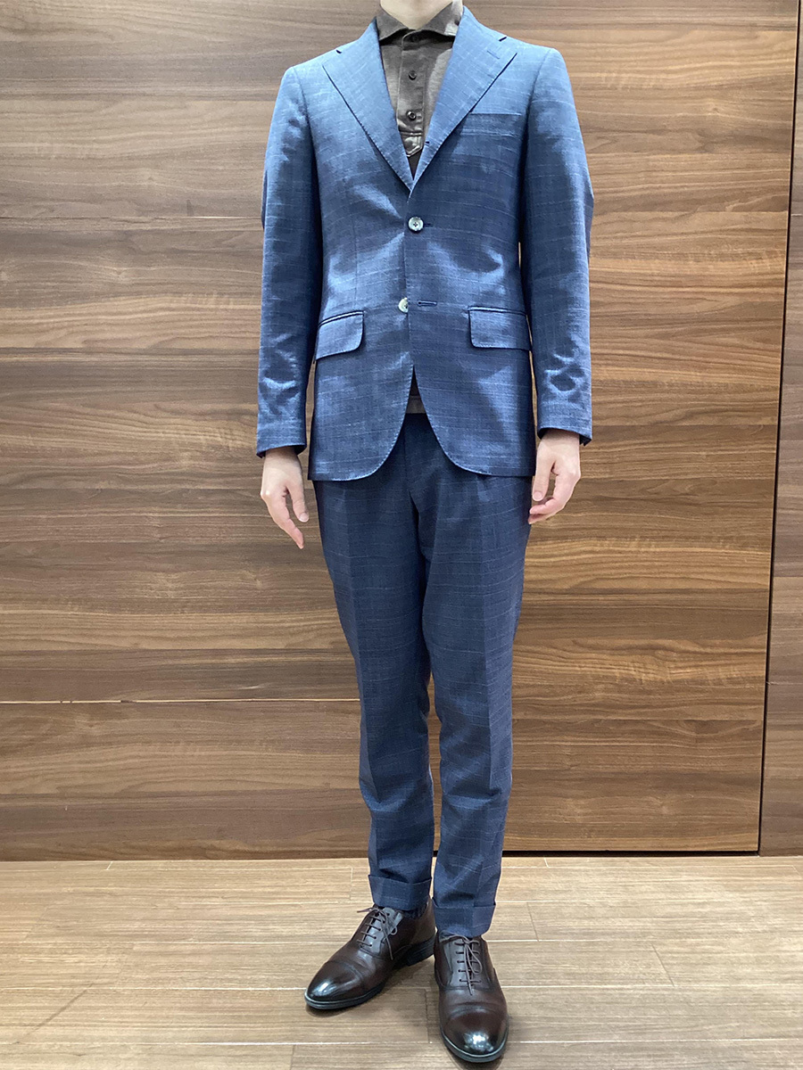 ブルーグレー×チェック柄の生地に、ブラウンのビズポロとシューズを合わせたビジカジコーデ。 生地品番:145008-1(Merino wool stretch)