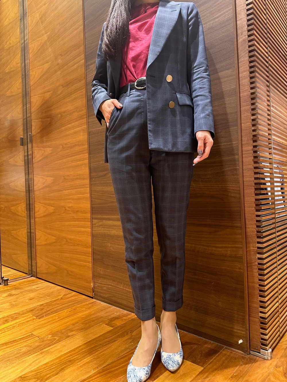 チェック柄の生地にシルバーメタルボタンのダブルにしてカジュアルっぽさを演出。柄のチェックに赤が入っているので差し色として華やかなピンクのインナーを合わせました。 生地品番 : 1800025(Tollegno)