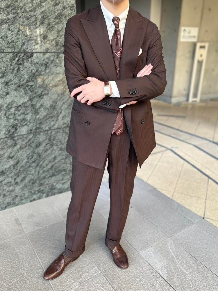 テラコッタのスーツ。ベージュのシャツやブラウンの同系色でまとめたコーディネート。 生地品番:1240026(SUPER100's AUTHENTICO)