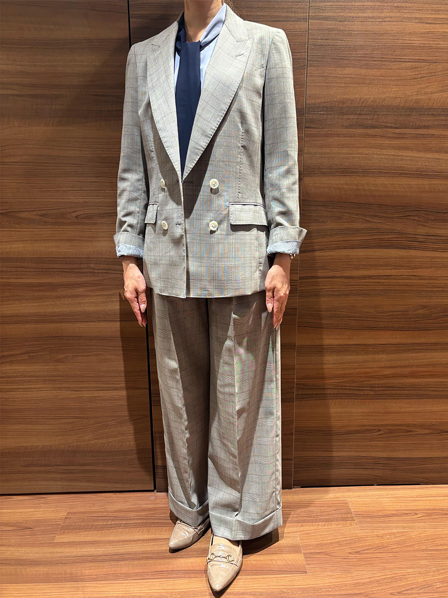 グレージュに白ボタンが映える、涼感ダブルスーツ