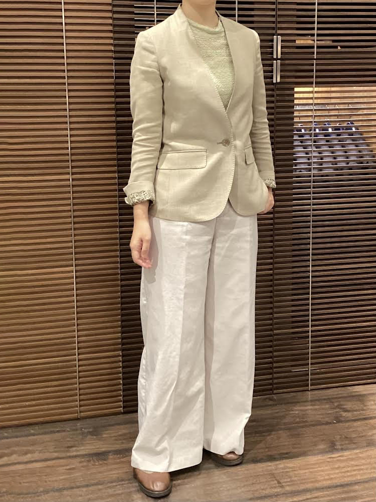 軽快感のあるオフホワイトのジャケットにグリーンレースのインナーを合わせ、涼しげな印象にしました。 袖裏地にペイズリー柄がアクセントになっています。 生地品番 ジャケット 1208300-1(HISPEC FABRIC)