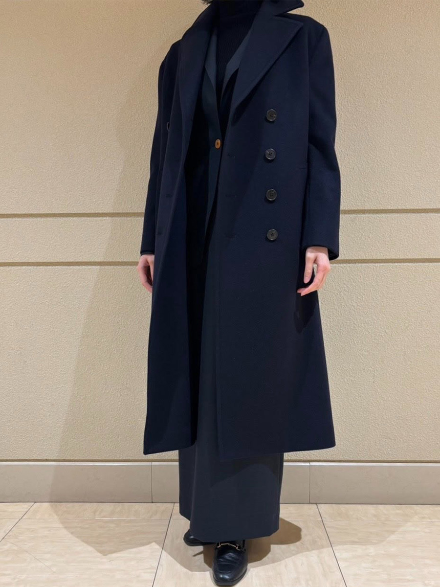 ロングコート使いが、大人の余裕を感じさせるシックなワンカラーコーディネート。 スーツ・コートそれぞれのラペルが美しくロールし、シンプルながらも仕立ての良さを表現している。 生地品番:6-W1A(ウールカシミア混ビーバー)