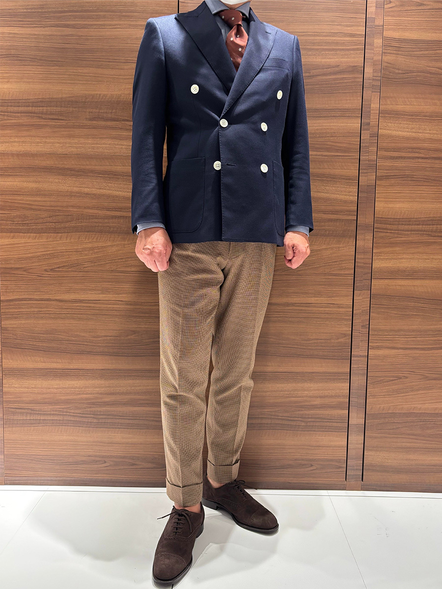 紺ブレコーデにブラウンを取り入れ、秋を感じる着こなし。