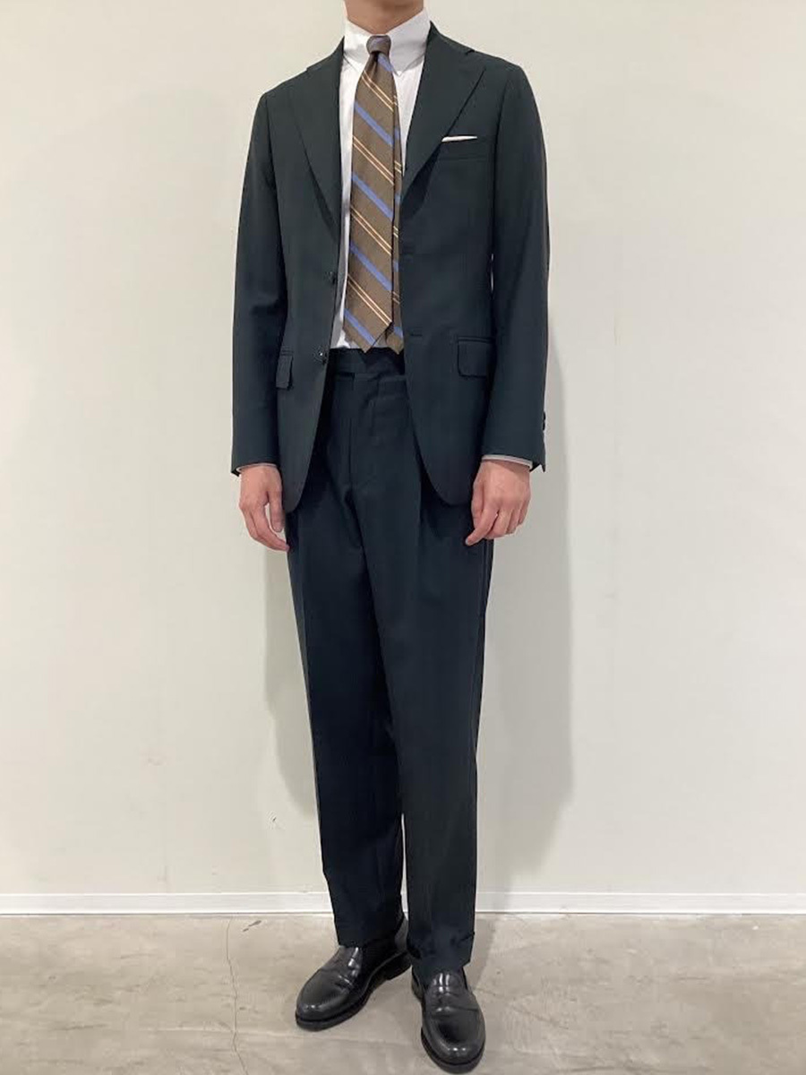 カーキのヘリンボーン柄で、クラシックで落ち着いたトーンのビジネススタイル。 無地のスーツに、ホワイトシャツを合わせ、ネクタイのレジメンタルを引き立たせるコーディネート。 生地品番:4240057(WOOLEX)