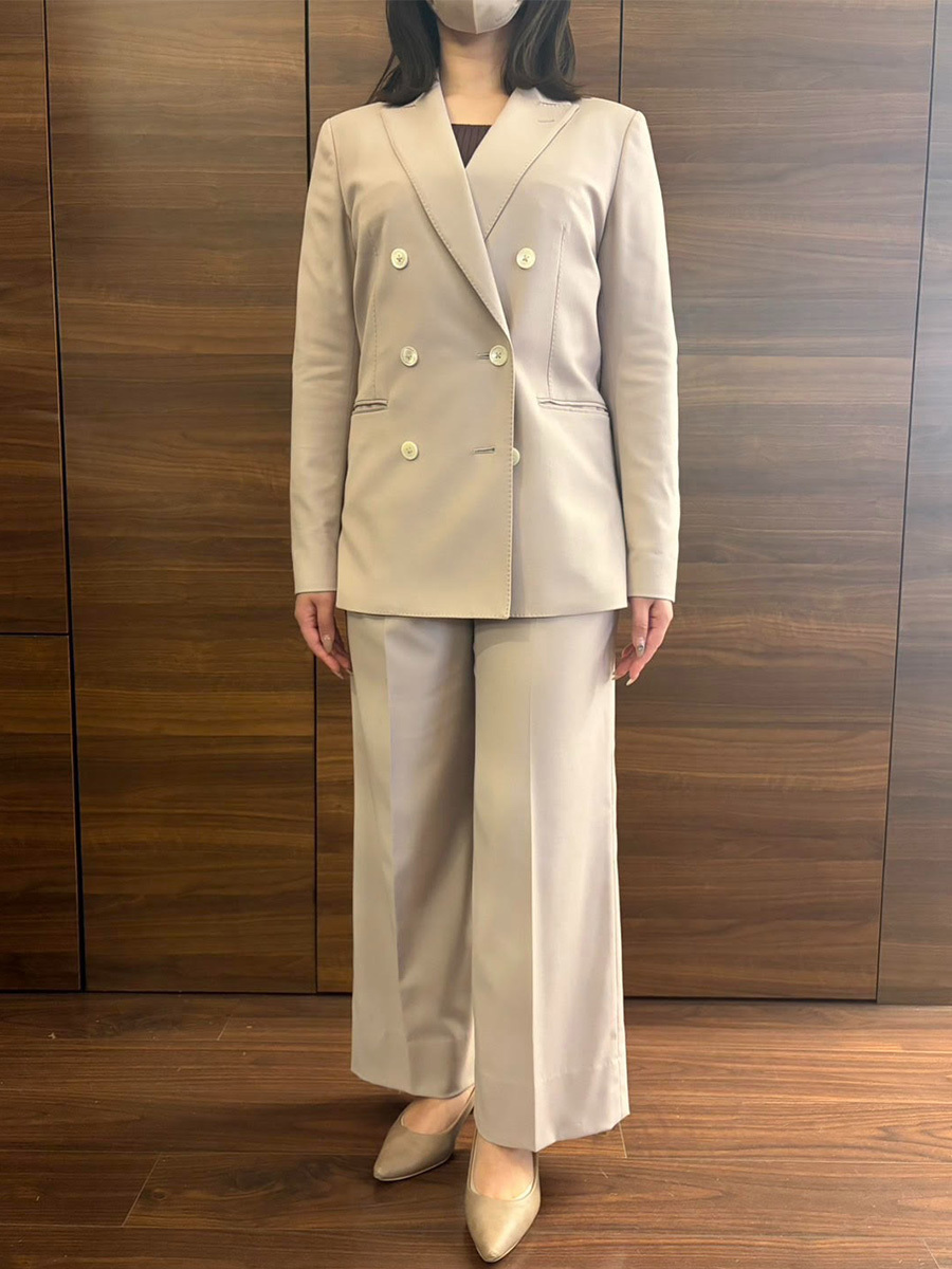 スーツとパンプスをベージュに統一することで、