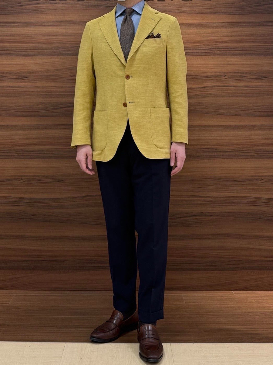 明るめイエロージャケットを活かした、リネンライクコーデ。