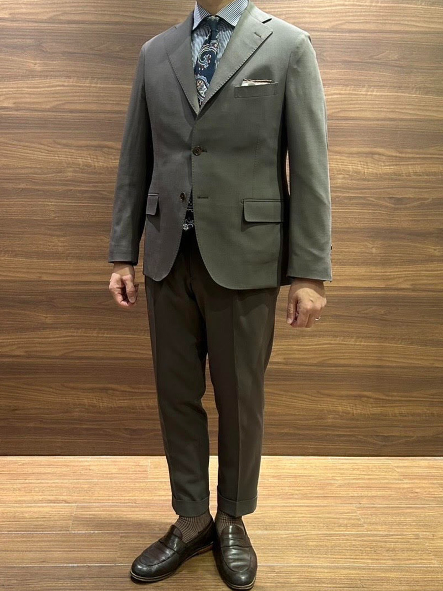 モカブラウンの落ち着きに、ネクタイで立体的な表情を授ける。