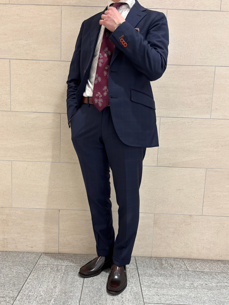 ブラウンのボタンとワインレッドのネクタイで秋を感じるコーディネートに仕上げました。