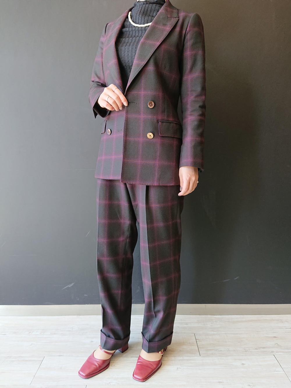 ワインレッドのチェック柄に、足元はレッドのパンプスで合わせたコーディネート。 生地品番:4240043(LANIFICIO F.LLI CERRUTI)