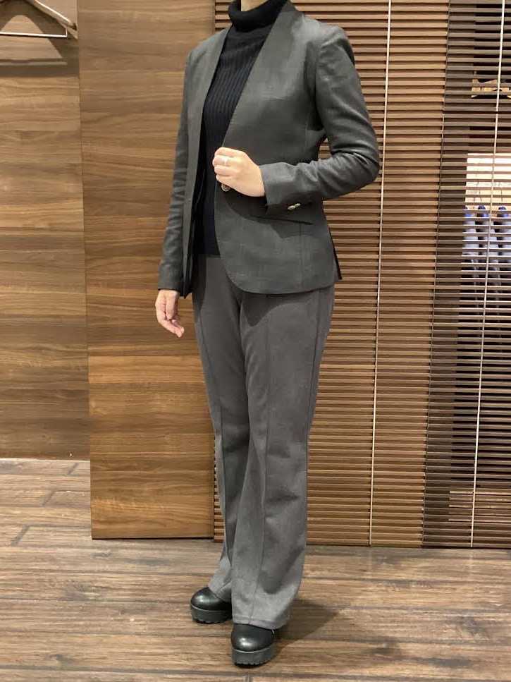 ダークグレージュのノーカラージャケットとブラックのインナーで、シックにまとめました。 大きめのシルバーリングがアクセントになっています。 生地品番 ジャケット 496009-7(LIMITED WOOL)